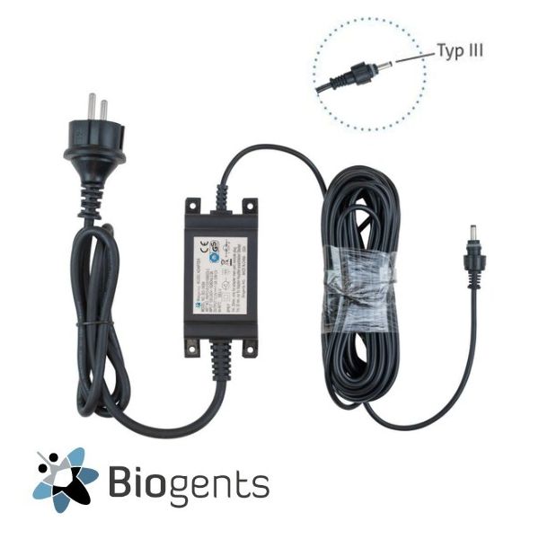 Alimentation électrique (12 V, 1 A, étanche IP 67) de Type III pour le piège à moustiques BG-Protector (nouveau modèle Réf 110-000768) de Biogents. Avec connecteur étanche IP67 et résistant aux particules.
