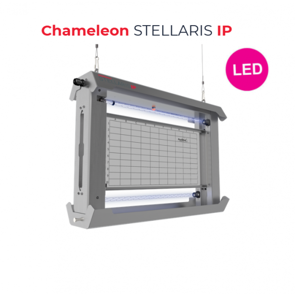 Le Chameleon® Stellaris IP66 est un dispositif de lutte contre les mouches à LED double face en acier inoxydable, certifié IP66, destiné aux grands espaces industriels ouverts.