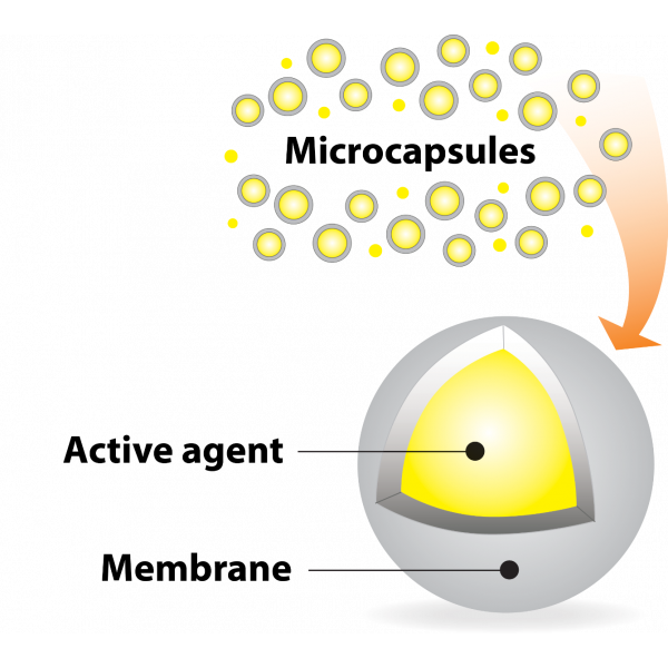 La microcapsule protège le principe actif - résistance aux températures élevées et à l'humidité.
