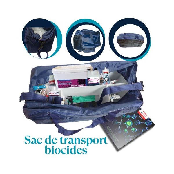 Utilisation : Le sac est conçu pour le transport des biocides sous toutes leurs formes (aérosols, flacons,...).